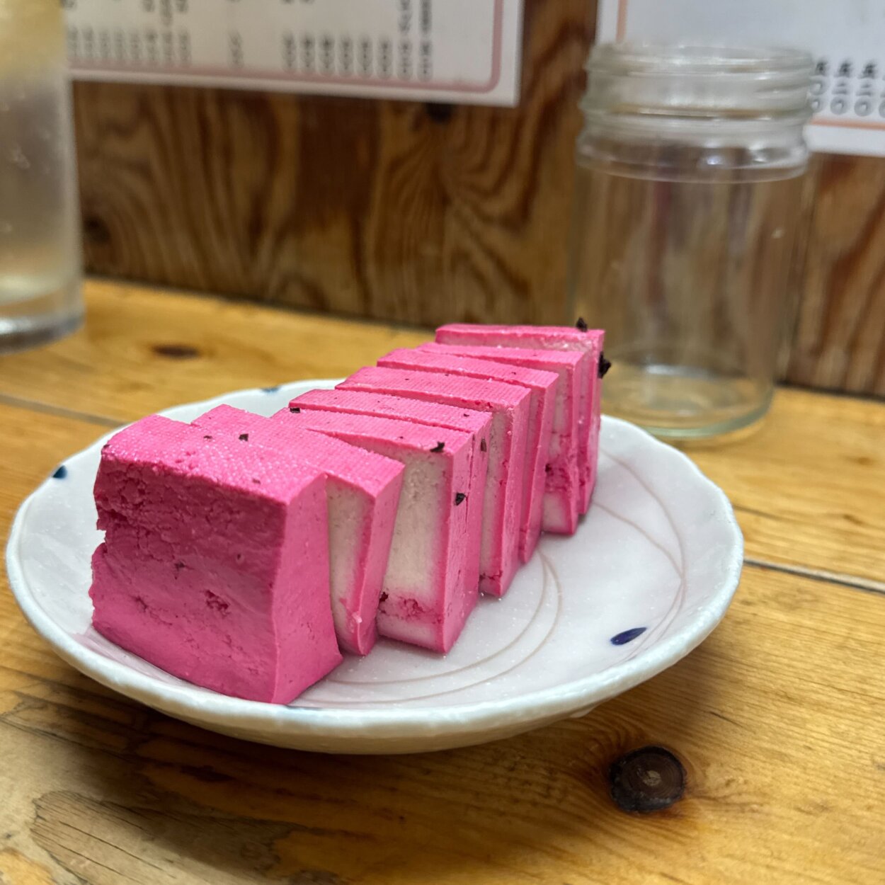 2軒目では、お決まりのタンやカシラとともに、鮮やかなピンク色の酢豆腐をつまみます。磯部さんは店内のテレビで流れる大相撲の中継に、若干視線を奪われつつ、2杯ほど飲んで3軒目へ。