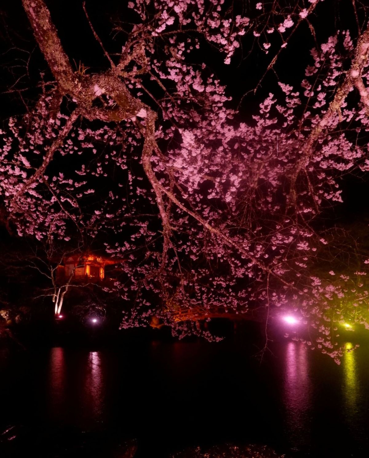 さらに奥まで進んでいくと、弁天池にライトアップされた弁天堂や桜が映り込む、『煌めき桜吹雪』が登場。よく見ると、桜の花びらの一つひとつに光が瞬く様子を鑑賞することができる。幽玄な趣を感じる空間で、移ろう季節の美しさに酔いしれよう。