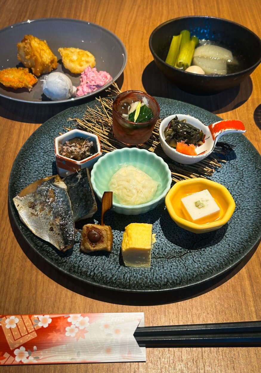 翌朝は、口コミでも高い支持率を誇る、ホテルの選べるメインとハーフビュッフェの朝食を満喫。選べるメインは、季節の和食が詰まった「八寸」がいちおし。なめらかな豆腐や味の染みた京野菜が、疲れた身体に染み渡る。