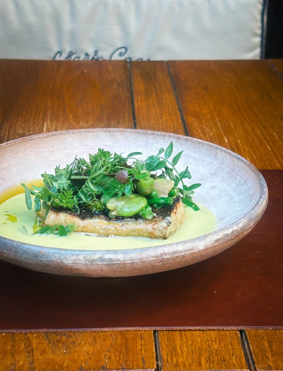 同店では、3月からメニューが刷新され、春限定メニューがスタートしたばかり。なかでも「天然スズキの炭火焼き アスパラガスソース 京野菜を添えて」は、7~10日間ほどドライエイジングし、身はやわらかく味がぎゅっと凝縮したスズキと、旬野菜のハーモニーを満喫できる一品。青々しくほのかな甘みを感じるソラマメやアスパラガスの味わいが魚のうま味を引き立てる。