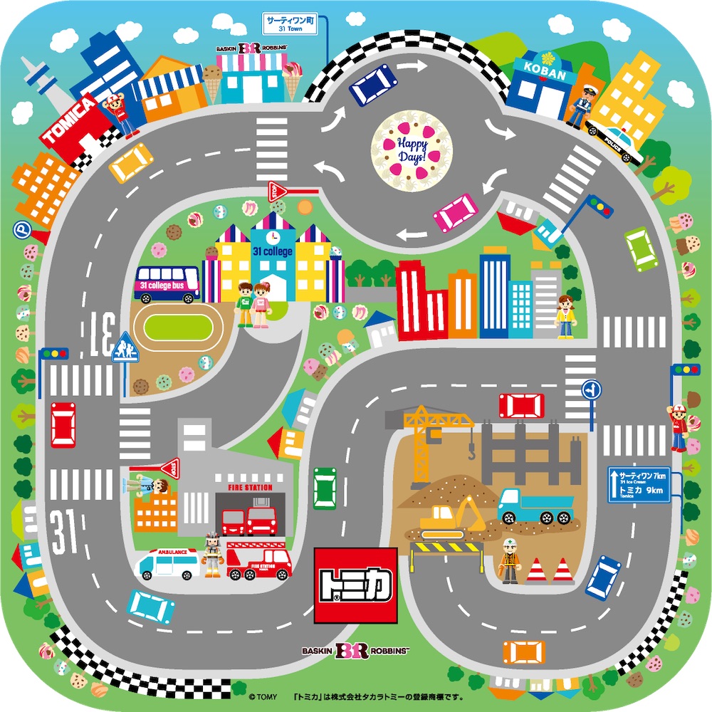 フィルムにも消防車やパトロールカー、工事車両が並び、にぎやかなサーティワンタウンの様子をイメージした台紙には、サーティワンのお店やアイスクリームを持った子供が標識に描かれ、わくわくするデザインとなっている。