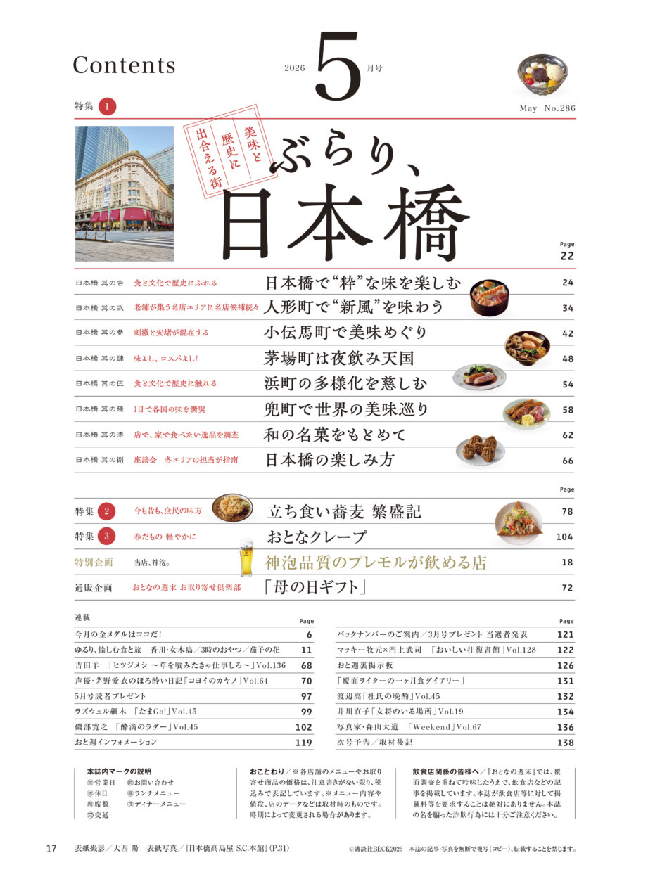 全店実食調査でお届けするグルメ情報誌『おとなの週末』。2026年4月15日発売の5月号では、「ぶらり、日本橋」を大特集!美味と歴史に出合える街・日本橋周辺のグルメをご紹介します。ほか、「立ち食い蕎麦 繁盛記」、「おとなクレープ」特集もあります。気になる最新号の内容をチラ見せです!
