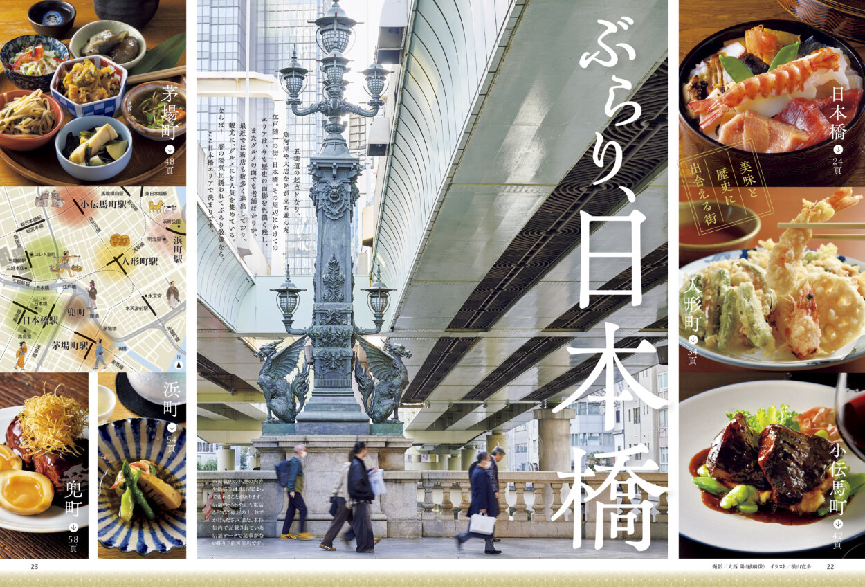 五街道の起点となり、魚河岸や大店などが立ち並んだ江戸随一の街・日本橋。その周辺にかけてのエリアは、今も歴史の面影を色濃く残し、またグルメの面でも老舗ばかりか、最近では新店も数多く進出しており、観光に、グルメにと人気を集めている。
