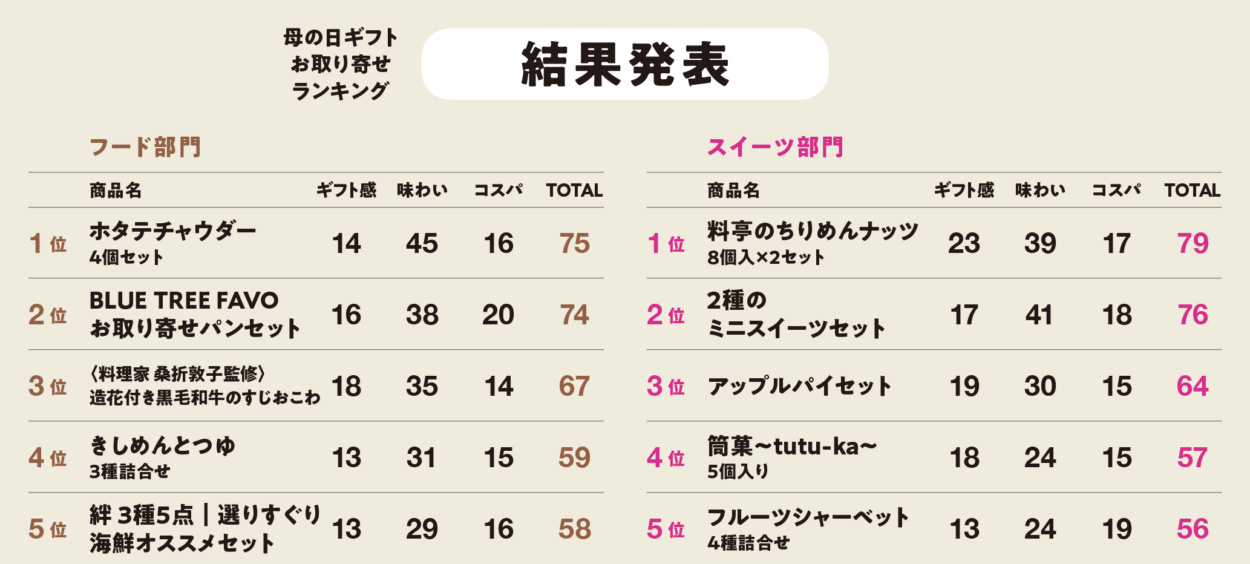 母に贈りたい、一緒に味わいたい美味をセレクト。お腹も心も満たす逸品が揃いました。スイーツ部門、フード部門をそれぞれ5位からご紹介します。