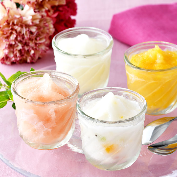 山形の食品メーカーが贈る、フルーツの果肉と果汁を贅沢に使用したシャーベット。山形産に限定した「白桃&さくらんぼ」、乳酸菌の爽やかな酸味際立つ「ホワイトフルーツミックス」など4種。シャリシャリ食感とともに、それぞれ果実の芳醇な香りに満たされる。