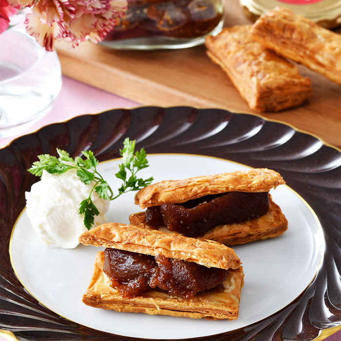 青森県産リンゴをキャラメリゼしたタタン(ジャム)と、手仕込みのフルタージュ(パイ)を詰め合わせに。サクサクのパイにタタンを挟めば、自分だけのできたてアップルパイが楽しめるという寸法だ。タタンは加熱すると香りや甘みが増すので、ぜひレンジで温めてどうぞ。
