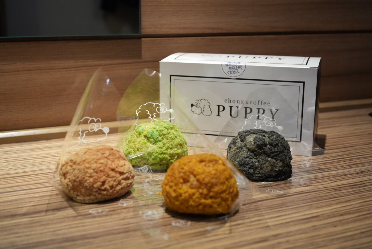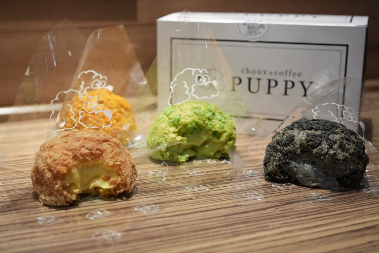 『PUPPY choux&coffee』「プレミアムパピーシュー」(380円)、「濃厚ピスタチオ」(480円)、「キャラメルバナナ」(400円)、「黒ゴマ」(400円)