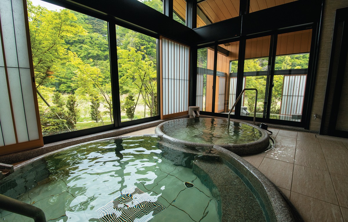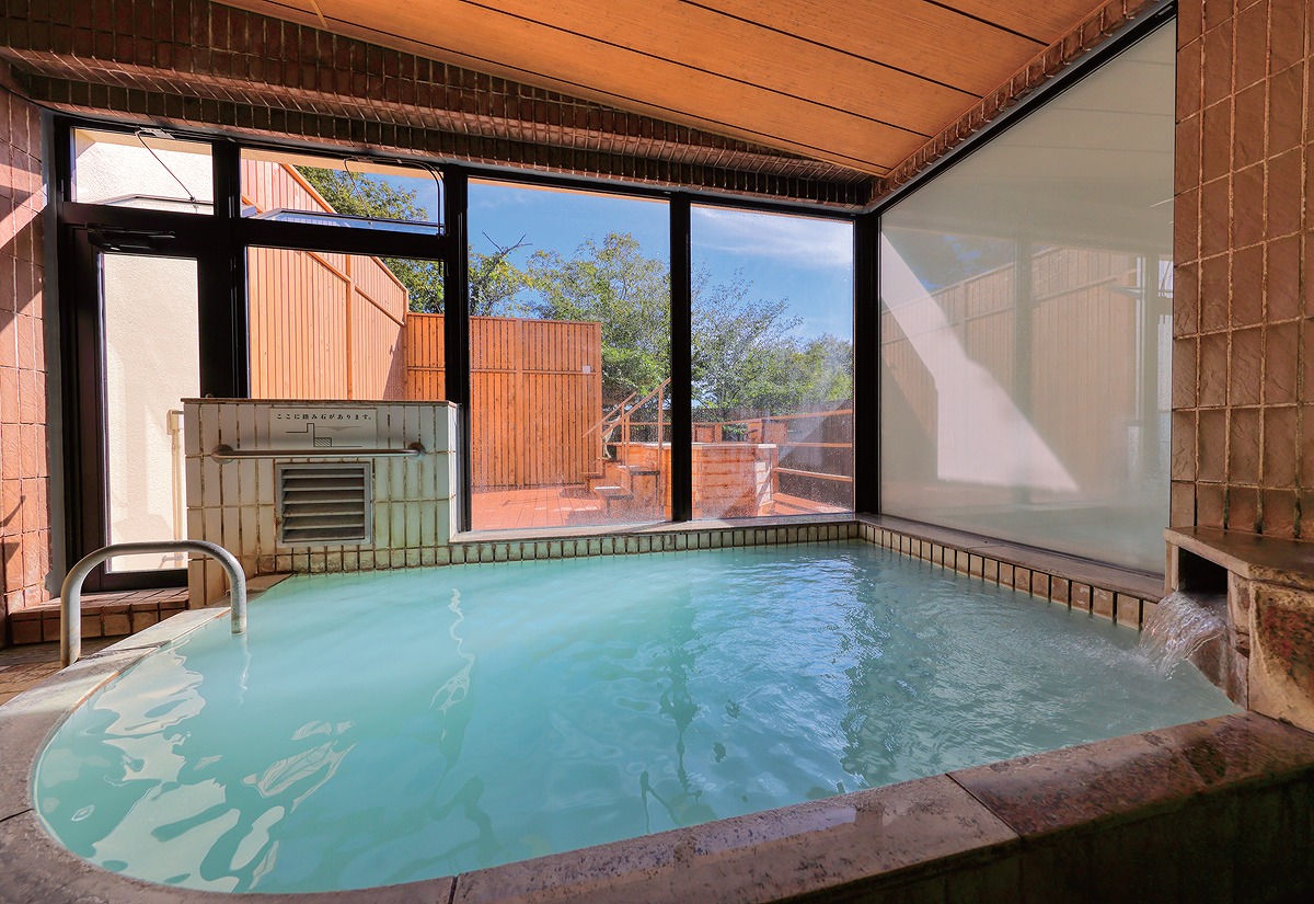 『離れの宿 楓音-kanon-(かのん)』半露天風呂と内湯が備わる大浴場は、夜間に男女が入れ替わる