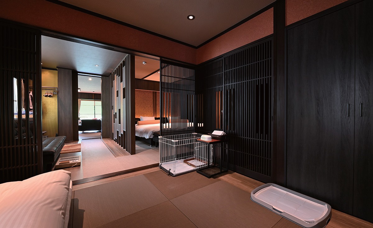 『悠久の宿 別邸 蜉蝣の月(かげろうのつき) 月フロア』「天空の月」にはこぢんまりとした和室やセミダブルベッド2台からなる寝室も設置。愛犬用のアメニティも充実している