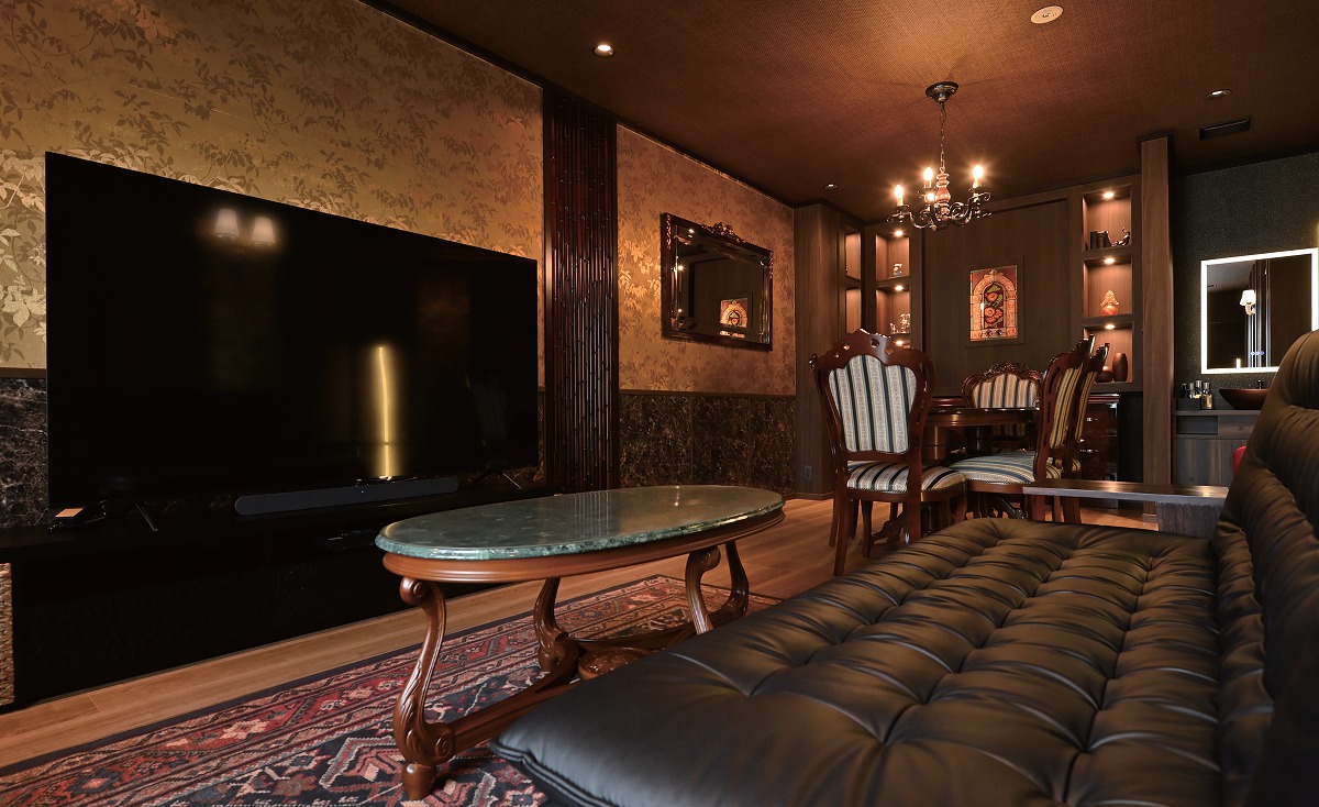 『悠久の宿 別邸 蜉蝣の月(かげろうのつき) 月フロア』「天空の月」のシアタールームの隣には、100 年前のステンドグラスがデザインアクセントのアンティークかつ重厚なダイニングルームがある