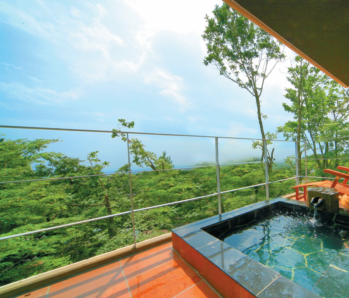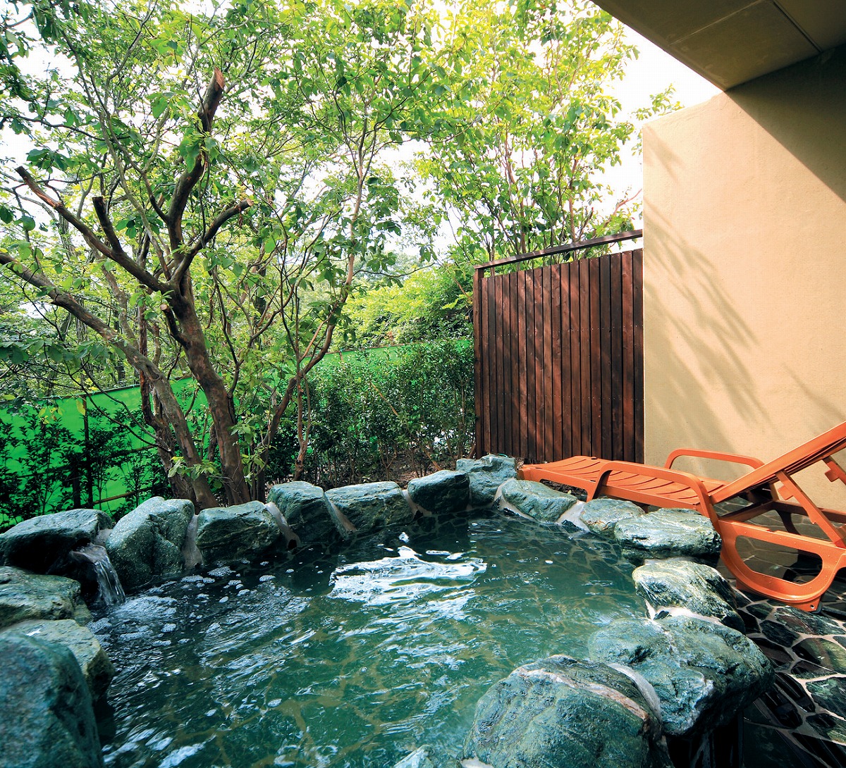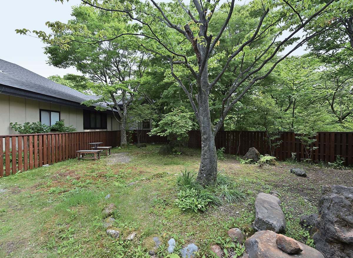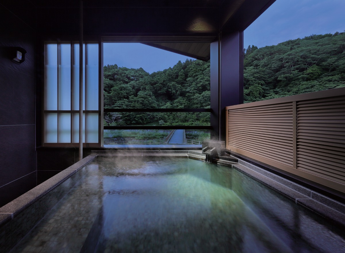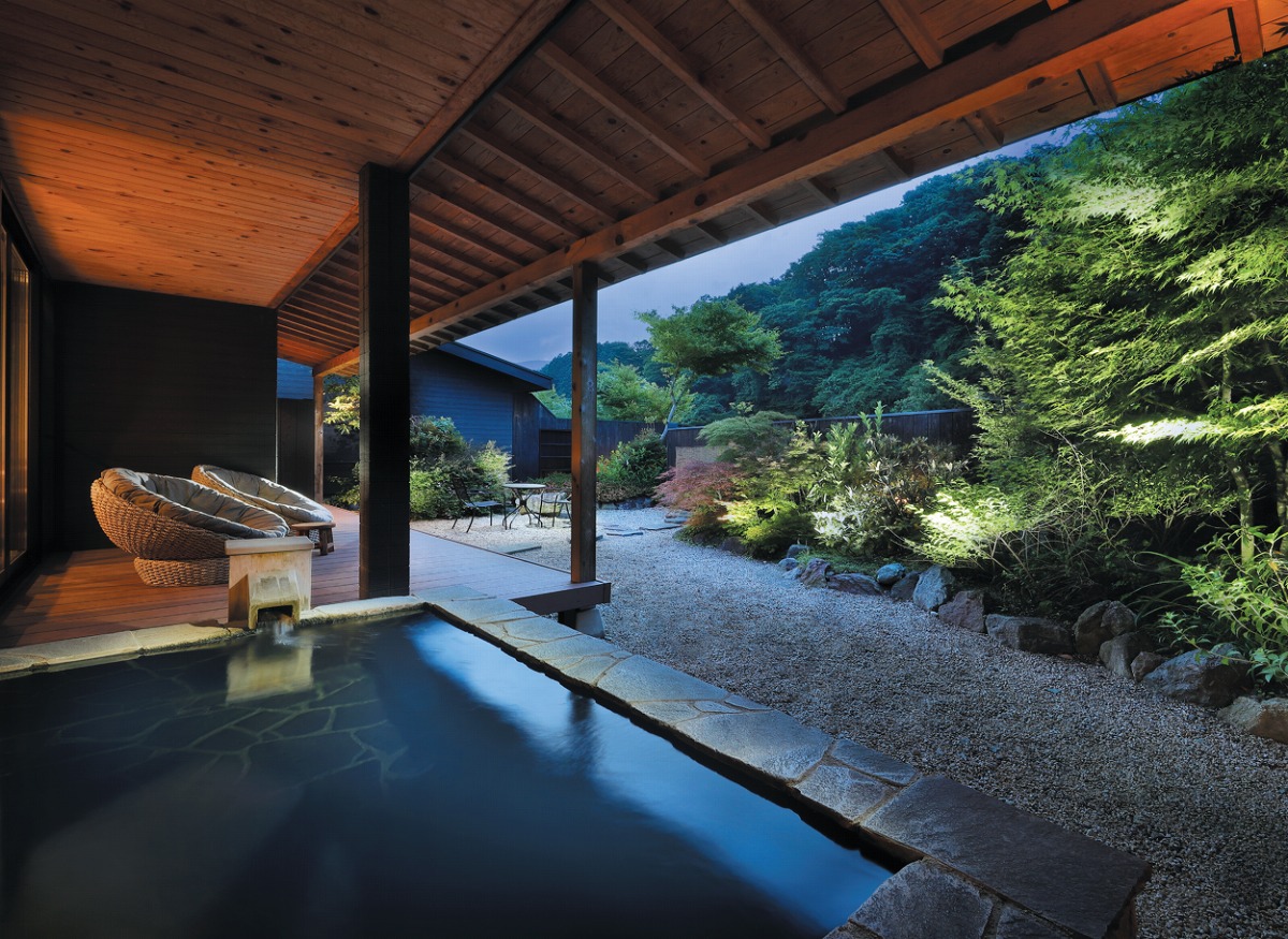 『ぬくもりに心なごむ湯宿 星のあかり』豊かな緑を望む1階客室の庭園露天風呂は広さも自慢