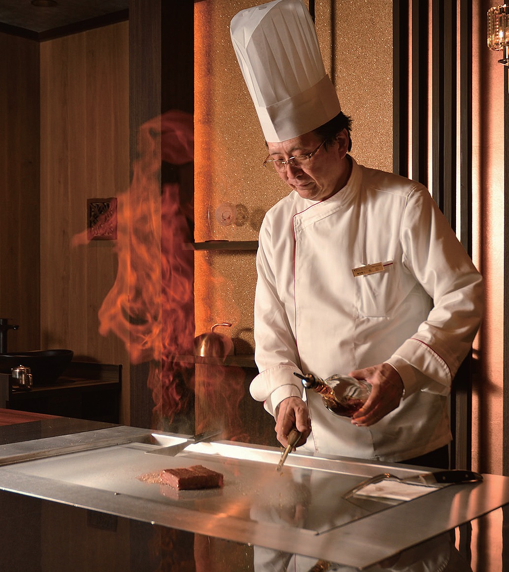 『悠久の宿 別邸 蜉蝣の月(かげろうのつき) 月フロア』天空の月」ではオーナーが専任シェフとして目の前で腕を振るってくれる、個室鉄板焼きのプレミアムプランも用意