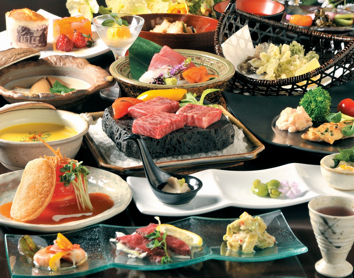 『ぬくもりに心なごむ湯宿 星のあかり』厳選食材が満載の和の創作フルコース一例。地元の猪肉や鹿肉を使ったジビエコースも用意