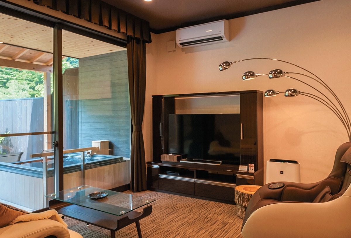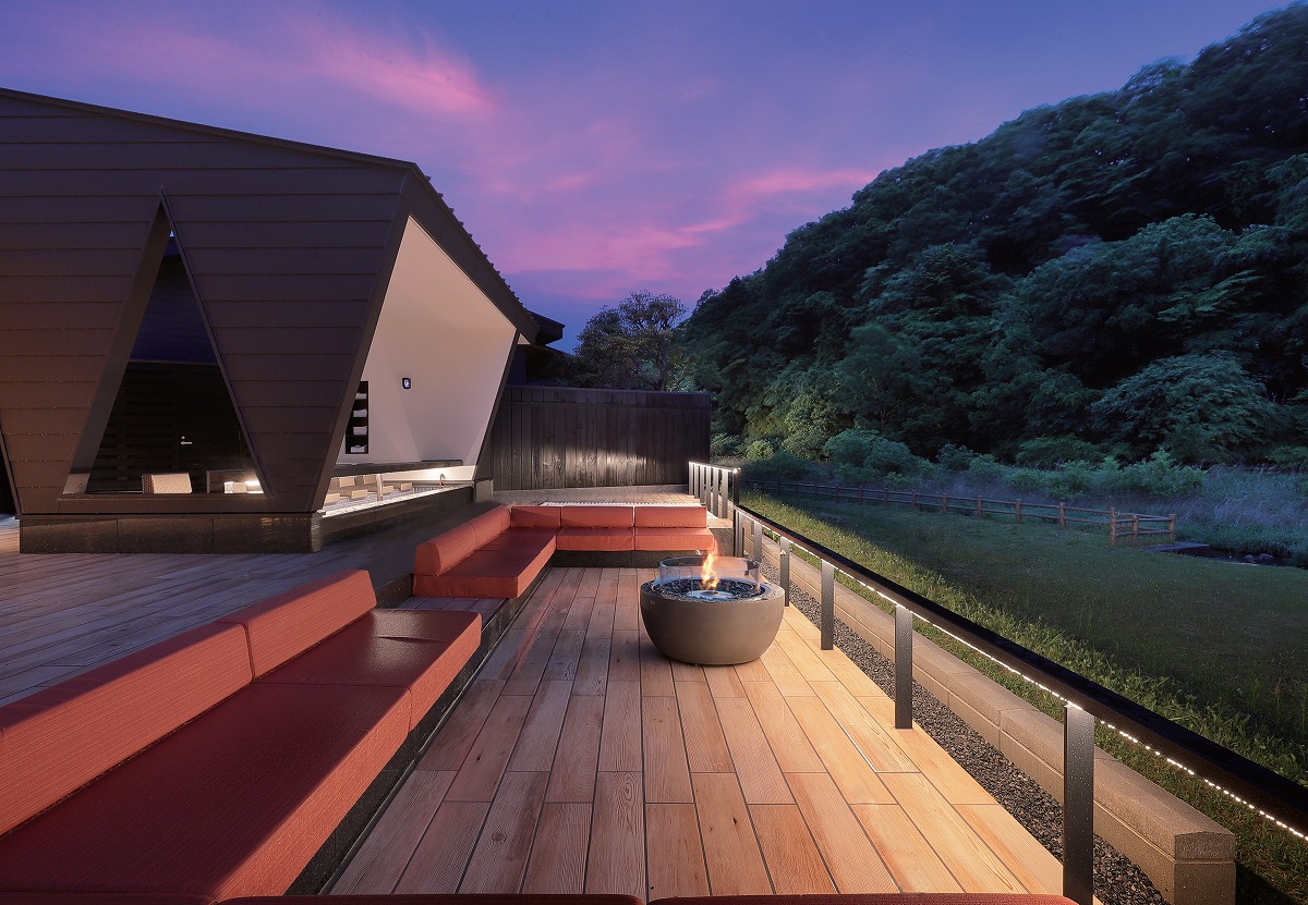 『露天風呂付きヴィラ 紅葉 KUREHA』フロント棟の屋外には、箒川に面した足湯テラスや暖炉を囲んだソファもしつらえる