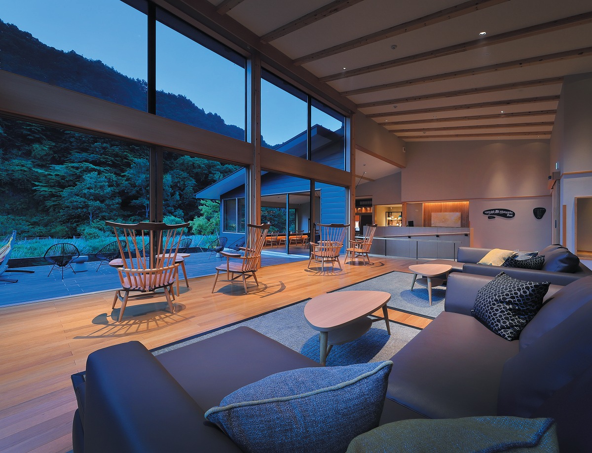『離れの宿 楓音-kanon-(かのん)』自然を眺めたり読書したり、思い思いにくつろげるロビー棟