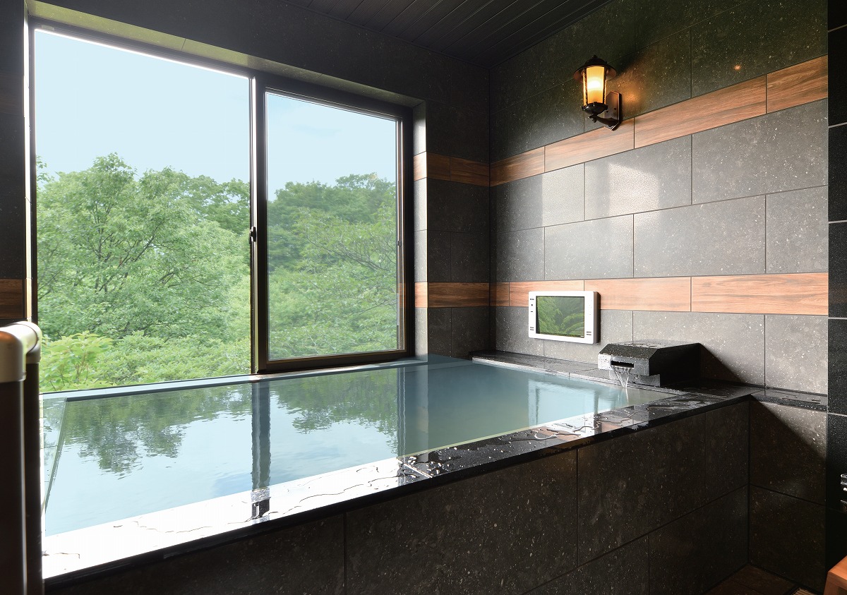 『露天風呂付きヴィラ 紅葉 KUREHA』【コンドミニアムヴィラ】6万150円〜 源泉かけ流しの半露天風呂は2 階に設置。2面採光の窓を全開放すれば、塩原の景色をより広く望める